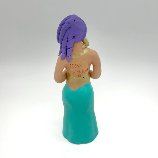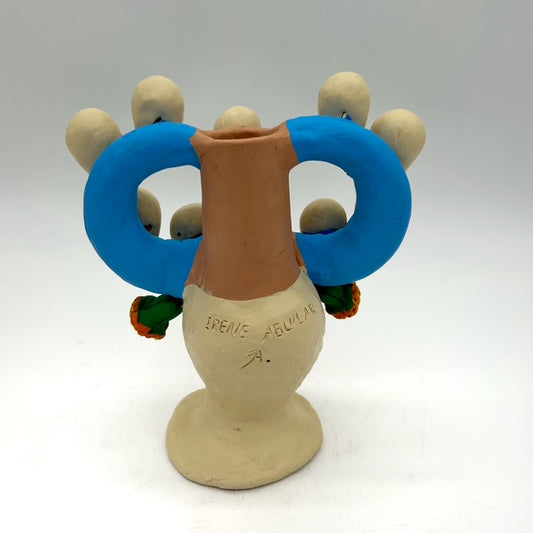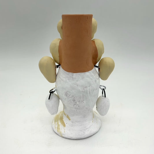 Irene Aguilar, third daughter of Isaura and Jesus, is known for her vivacious and imaginative spirit throughout her work. She creates ceramic pieces such as musicians, devils, monks, "women of the night", "Catrinas" -elegantly dressed female figures for Day of the Dead, and "Fruteros"- fruit bowls on the lips of which sit ain array of figures including lovers, the Three Kings and "Muertos" -skeleton figures engaged in human activities. In addition, she creates spectacular larger works, such as complex market scenes and flower stands with multiple parts.