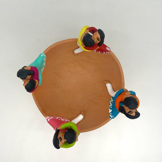Irene Aguilar, third daughter of Isaura and Jesus, is known for her vivacious and imaginative spirit throughout her work. She creates ceramic pieces such as musicians, devils, monks, "women of the night", "Catrinas" -elegantly dressed female figures for Day of the Dead, and "Fruteros"- fruit bowls on the lips of which sit ain array of figures including lovers, the Three Kings and "Muertos" -skeleton figures engaged in human activities. In addition, she creates spectacular larger works, such as complex market scenes and flower stands with multiple parts.
