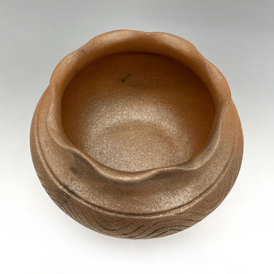 Rhonda Avidon ~ 4 Quart Mica Bean Pot with Fluted Rim and Incised Design, 6" x 9 1/4" x 9 1/4"