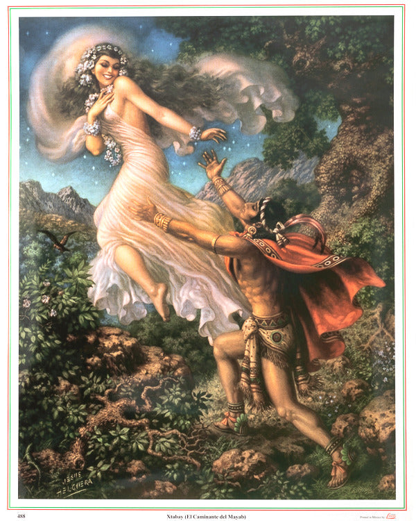 Colorful image of woman floating in the air, with warrior reaching for her, printed in Mexico.
