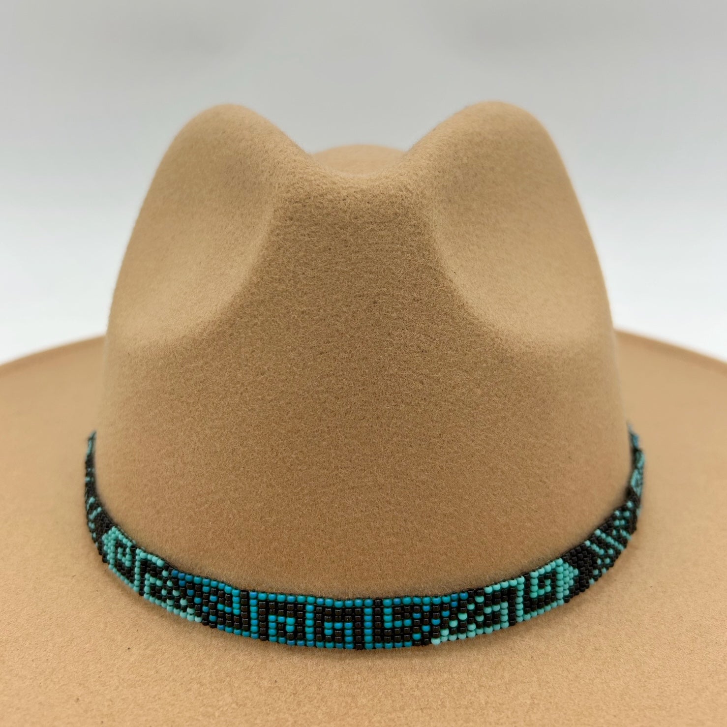 Hand-beaded hat band with Roman motiff in green, turquoise and black with leather ties.