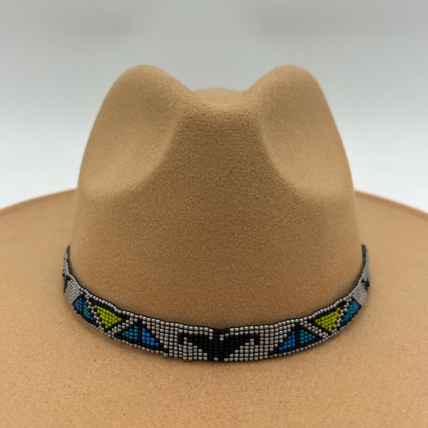 Hand-beaded hat band with Thunderbird design, in gray, turquoise, lime and black with leather ties.