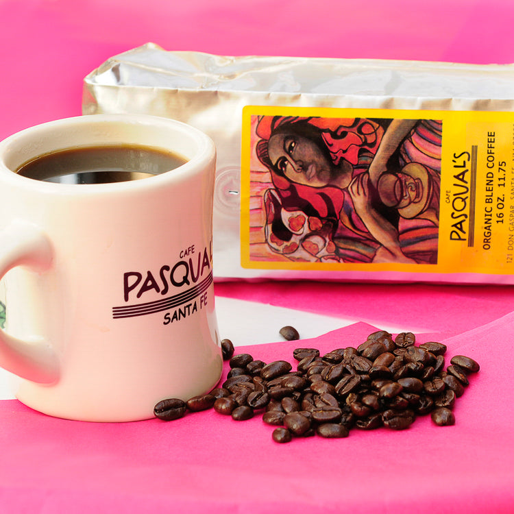 The official mug of Cafe Pasqual's. Keep your hot drinks hot in the 10 oz. white porcelain flagon. Please wash by hand.