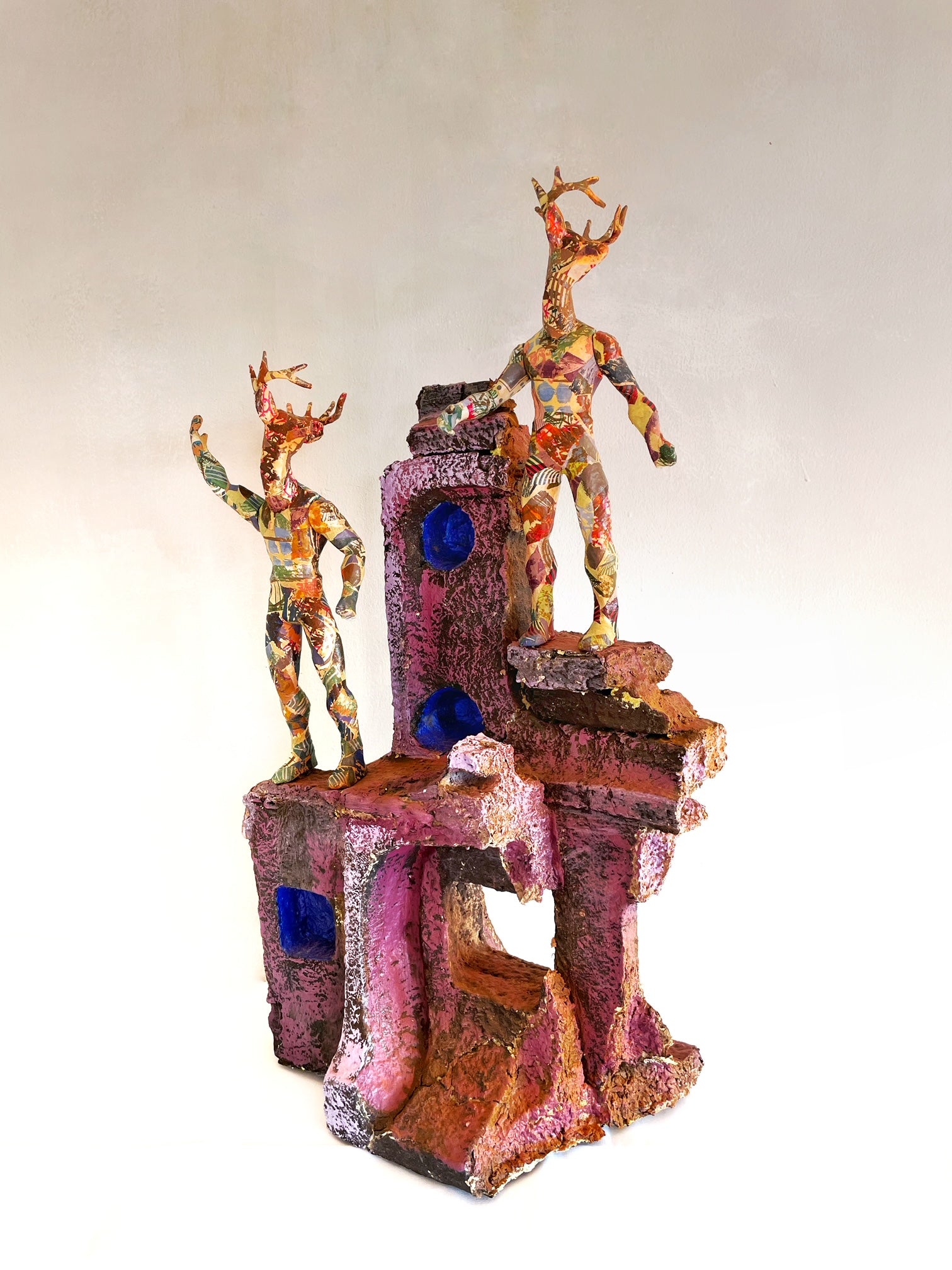 Made from all recycled paper on recycled styrofoam base. Deer men have articulated arms