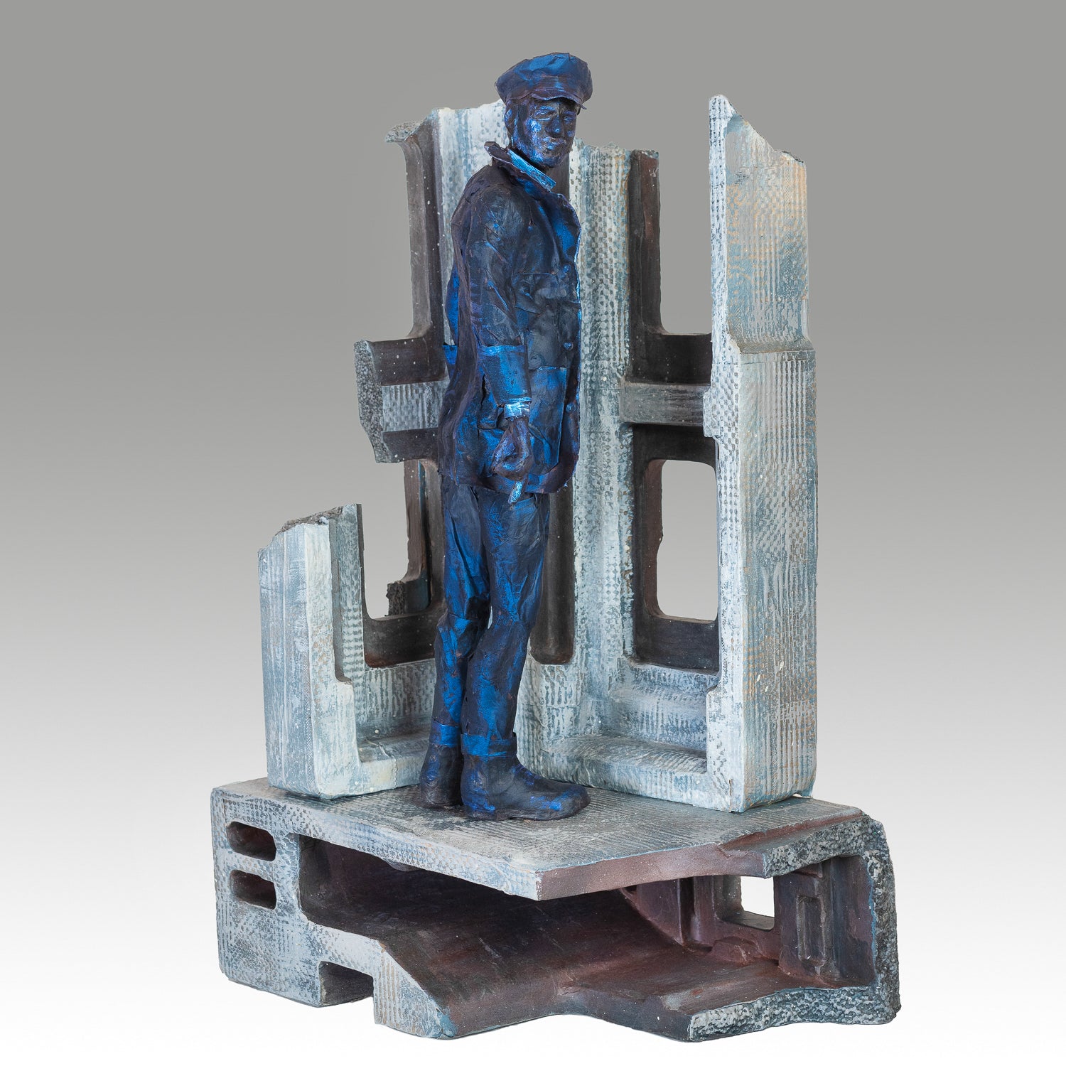 Inspired by a dream Rick had "Hoboken Ghost" man in the City is a thought provoking piece with a haunting quality. Made from all recycled paper on recycled styrofoam base. 24" x 16" x 10"