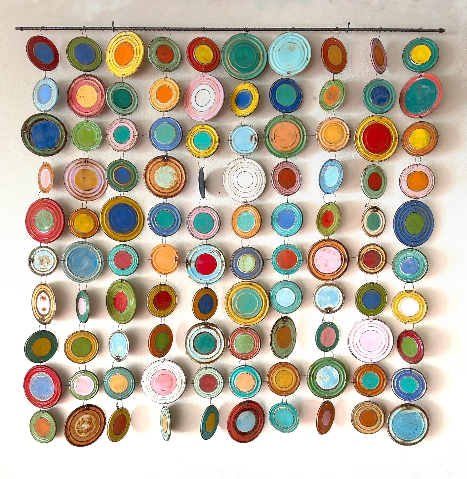 Hand made metal wall hanging tin can lids, wire, paint