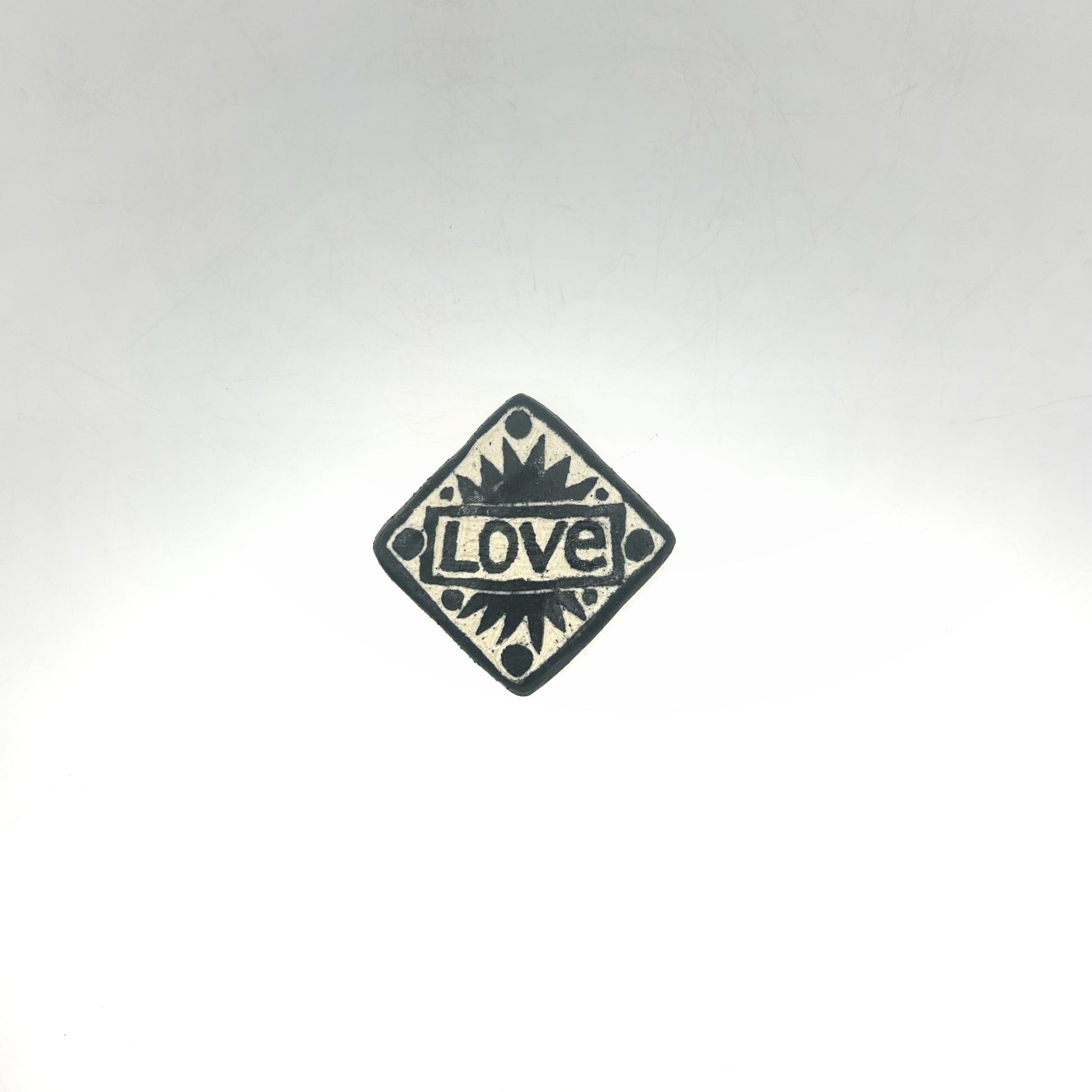 Love lettering and geometric design on white clay.