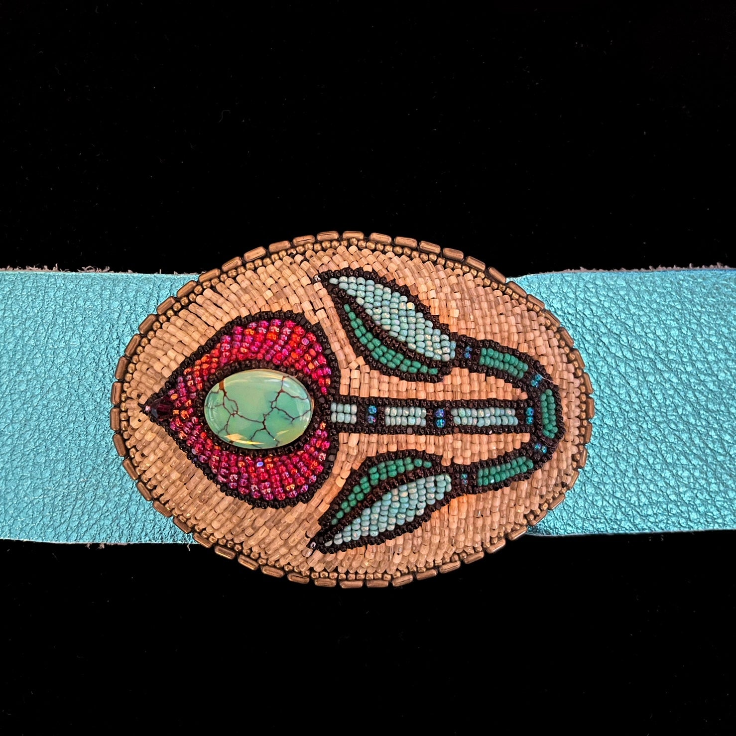 Hand-beaded belt buckle featuring a flower design featuring a turquoise stone on sheepskin leather.