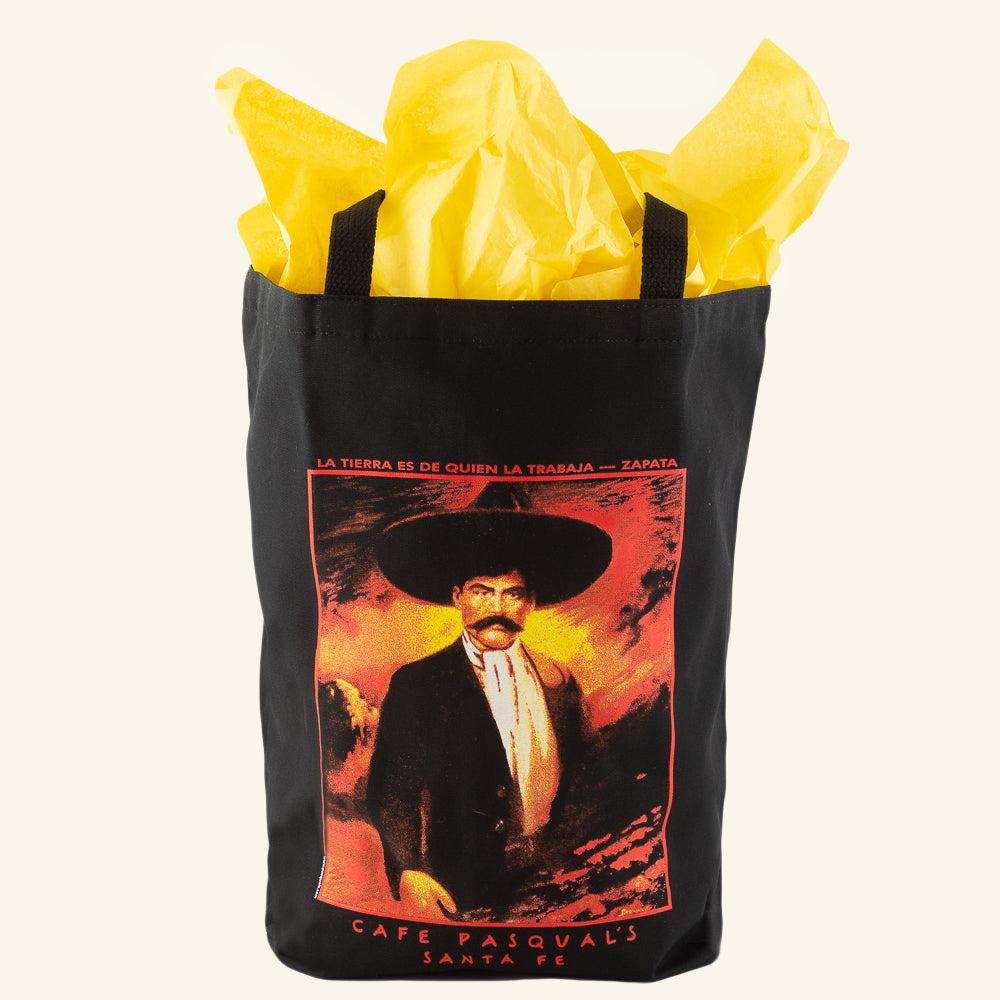 Sturdy canvas bag for groceries or anything you need to carry. Measures 17" x 10 3/4" x 7" with 30" strap. Picturing agrarian leader and hero of the Mexican revolution Emiliano Zapata.